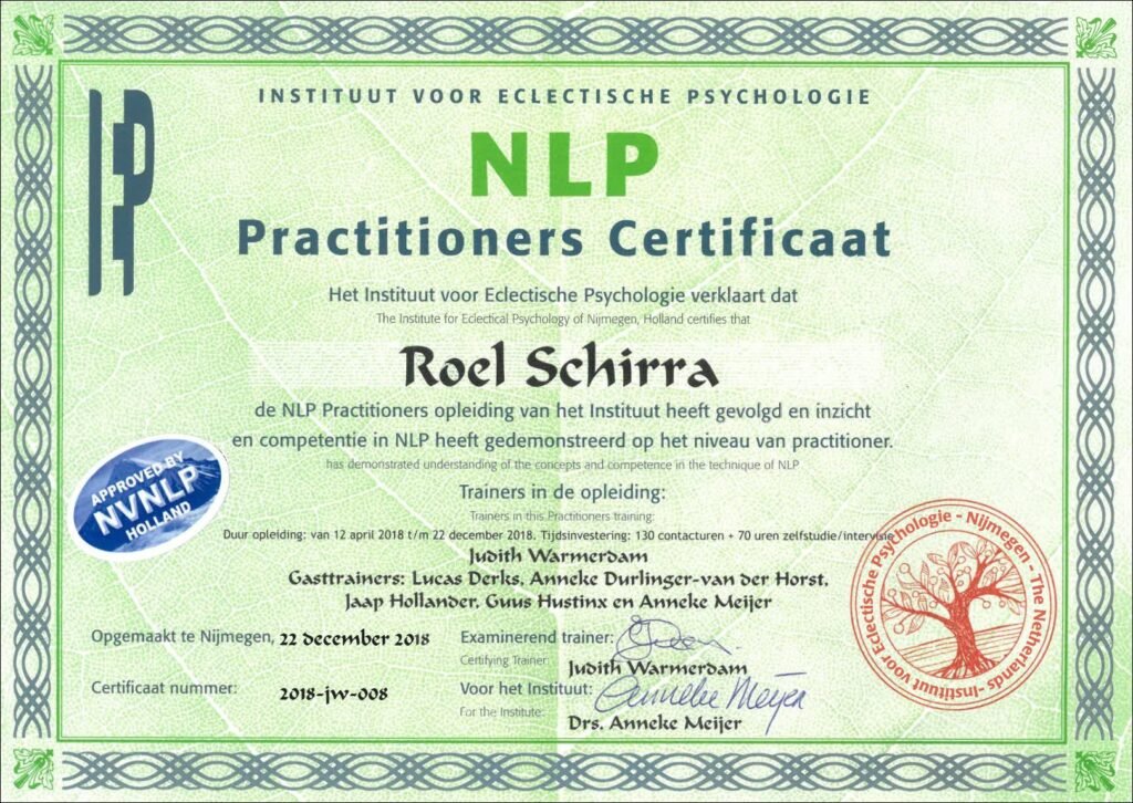 Tijdens mijn rol als senior medewerker én de rollen bij bol.com, volgde ik naast mijn werkzaamheden de nodige cursussen op het gebied van coaching en psychologie. Bij het NCOI deed ik een Masterclass Coaching en Psychologie. Bij het IEP behaalde ik mijn diploma als NLP Practitioner. Later voegde ik daar ook nog Acceptance and Commitment Therapy (ACT) aan toen via het Civas.